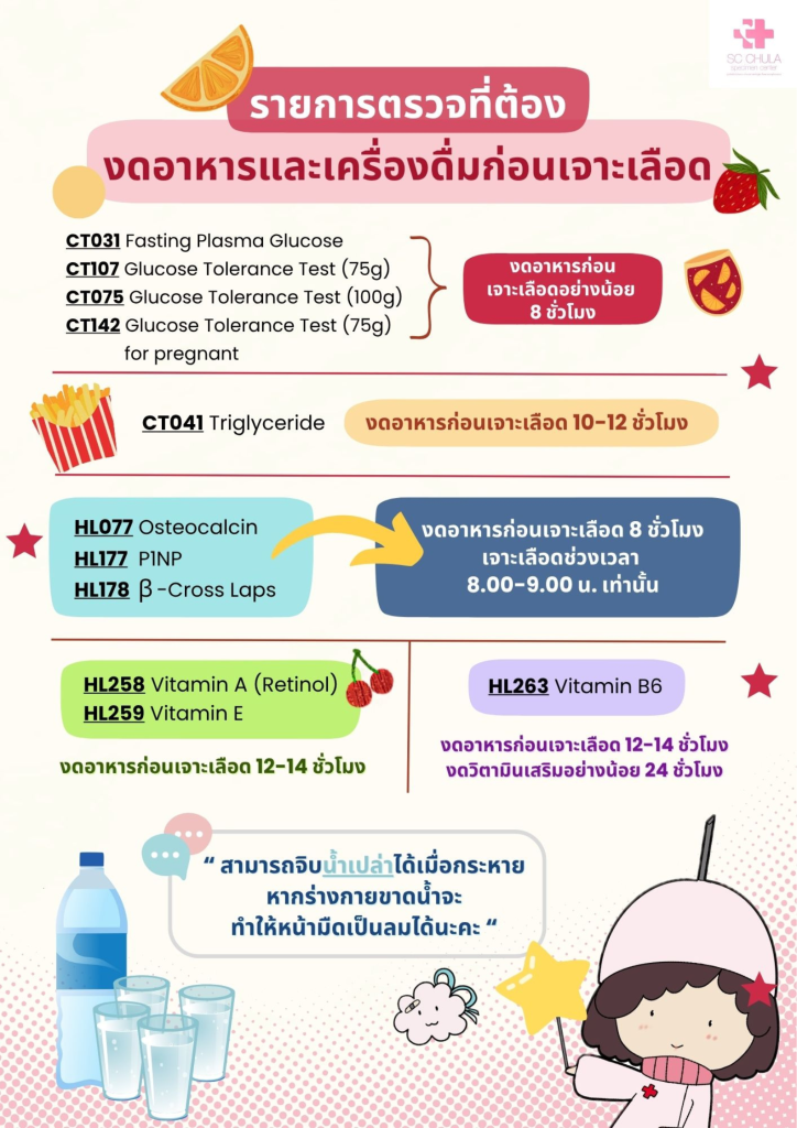 หมายเหตุ : ในการงดอาหารและเครื่องดื่มก่อนเจาะเลือด สามารถดื่มน้ำเปล่าได้เมื่อกระหาย